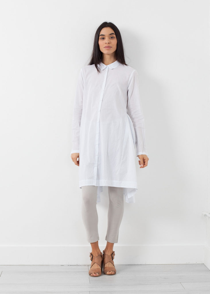 The Rundholz Black Label collection emphasizes accessibility in fashion. The Shell Dress is the shirtdress, reimagined. Gathered accsents at sides, pleated details at back waist. Button placket closure at front. Color White. 100% Cotton. Ashley is wearing an X-Small.