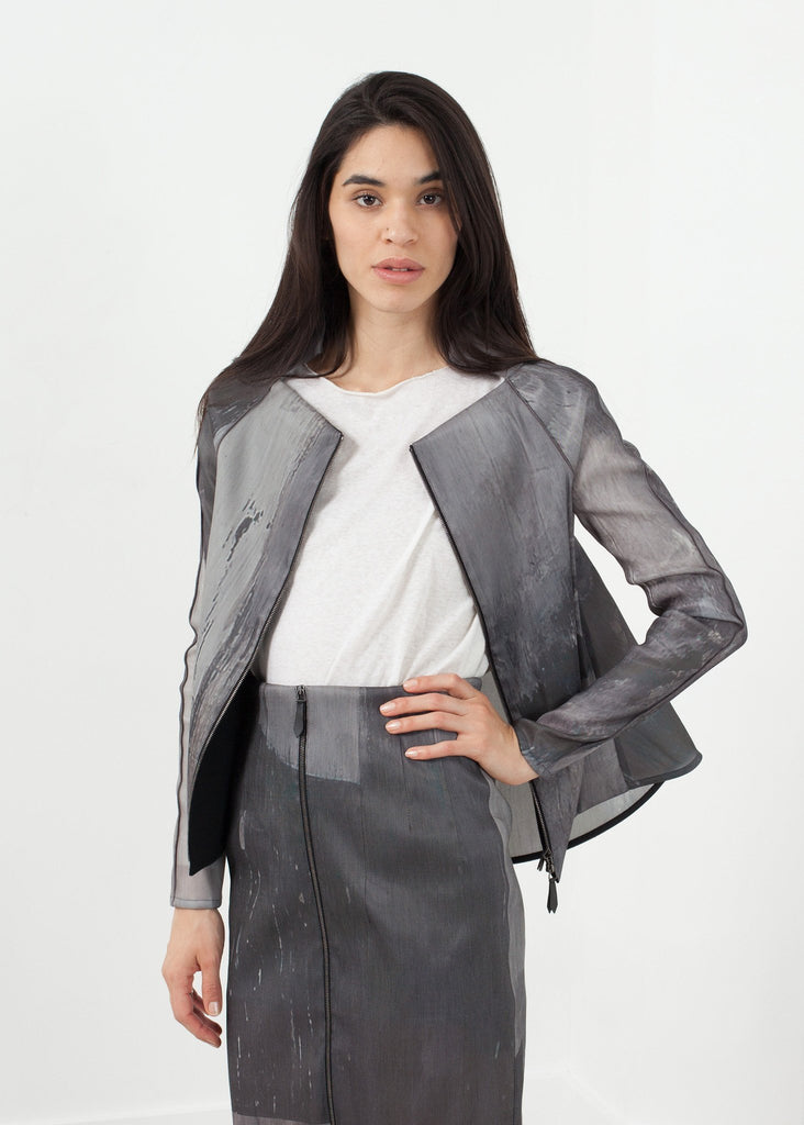 The Dixi Jacket presents enough stretch for a more flattering fit in a modern silhouette. Wide front neckline with standing collar adds contemplation. Full length zip at center front. Front pockets. Annette Gortz. Color Check. 64% Polyamide, 29% Cotton, 7% Spandex, Trimming 70% Linen, 27% Viscose, 3% Spandex. Made in the EU. Ashley is wearing a 34.