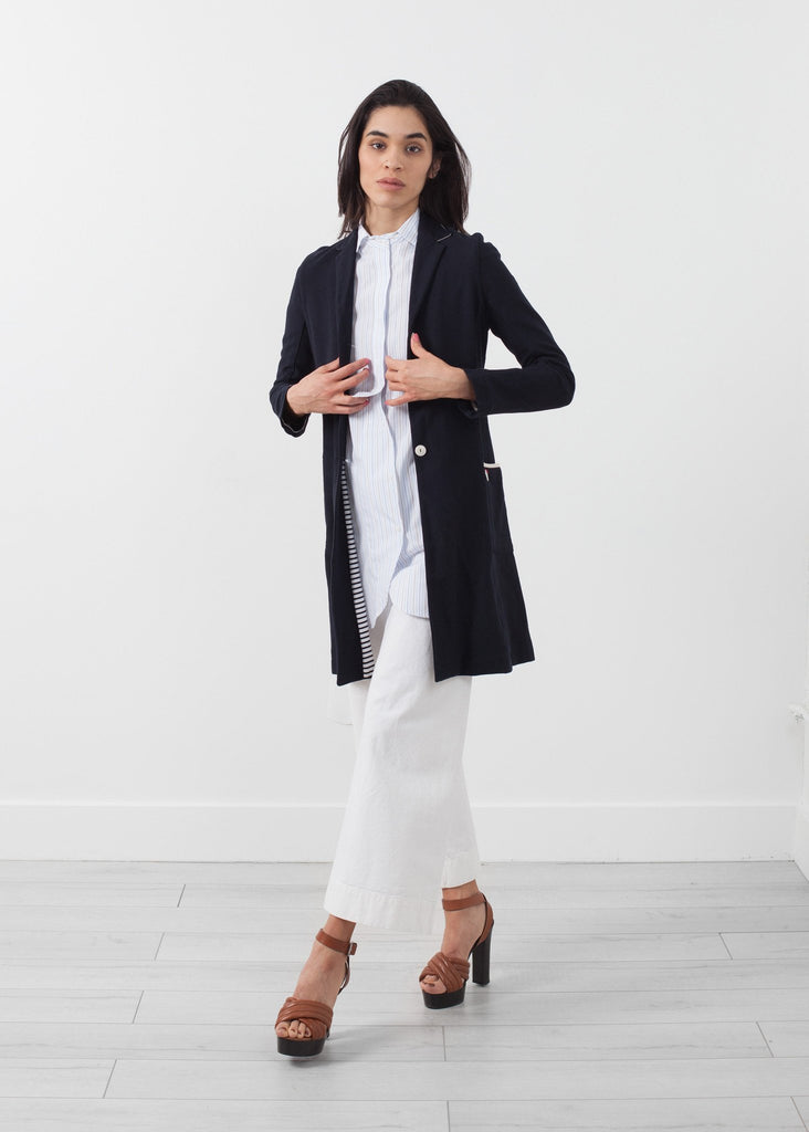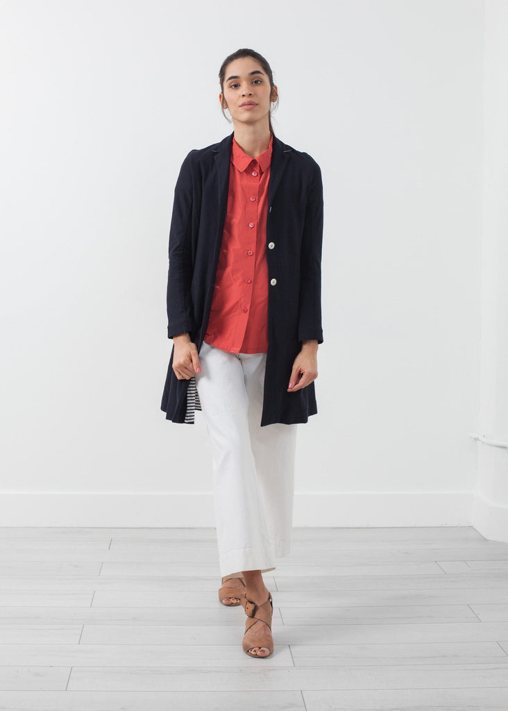 The Halo is a classic trench with the comfort of cotton. Three button placket closure. Exterior pockets at side. Fully lined. Yoshi Kondo. Color Navy. 100% Cotton, Lining 100% Cotton. Made in Romania. Ashley is wearing a Small.