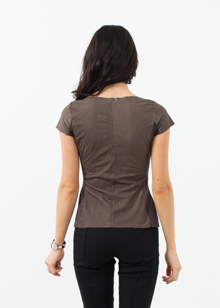 The Leather T is an industrious piece with its unfinished hems and sueded leather. Constructed of contrasting panels, the T is a flattering fit and shapely. Scoop neckline. Capped sleeves. Hazel Brown. Color Grey. 100% Pigsuede, 2nd Fabric 100% Cotton. Ashley is wearing the size 1.