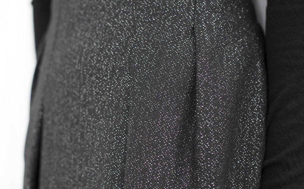 Lurex thread weaves its way through this lightweight skirt adding lustrous shine as you walk. Waist darts at front and back define the silhouette. Closed with an invisible zipper. Mauro Grifoni. Color Black/Silver. 29% Acrylic, 28% Polyester, 26% Wool. Made in Italy. Lana is wearing an Italian 40.