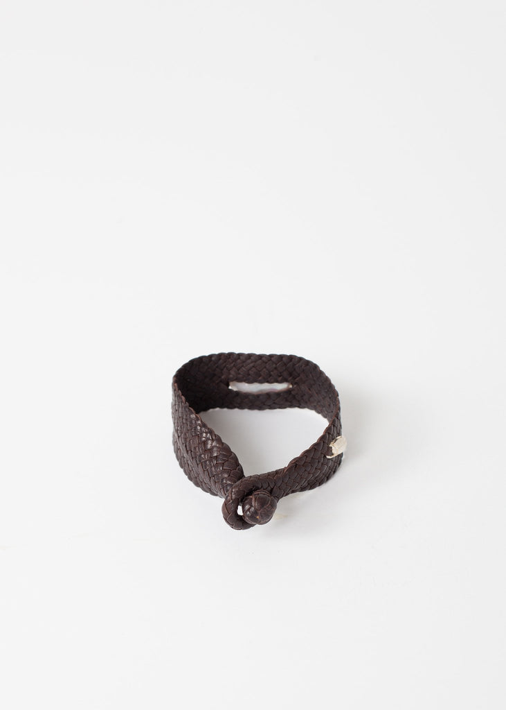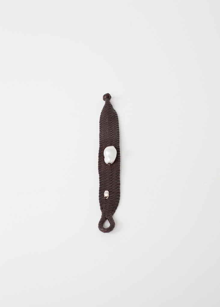 Kalosoma Jewelry demonstrates the rigorous beauty in the handmade. Braided leather acts as the canvas for an asymmetrical pearl. Scarab detail. Knotted closure. Color Brown. 100% Leather. Made in Mexico. Length 7 1/2 inches.