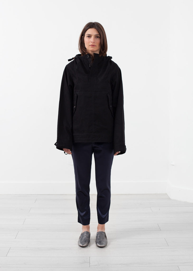Unisex outer-layer to keep you warm and dry. Three button placket at front. Two exterior button pockets. Drawstring waistband. Adjustable hood. Hansen. Color Black. 100% Cotton. Made in EU. Lana is wearing an XSmall.