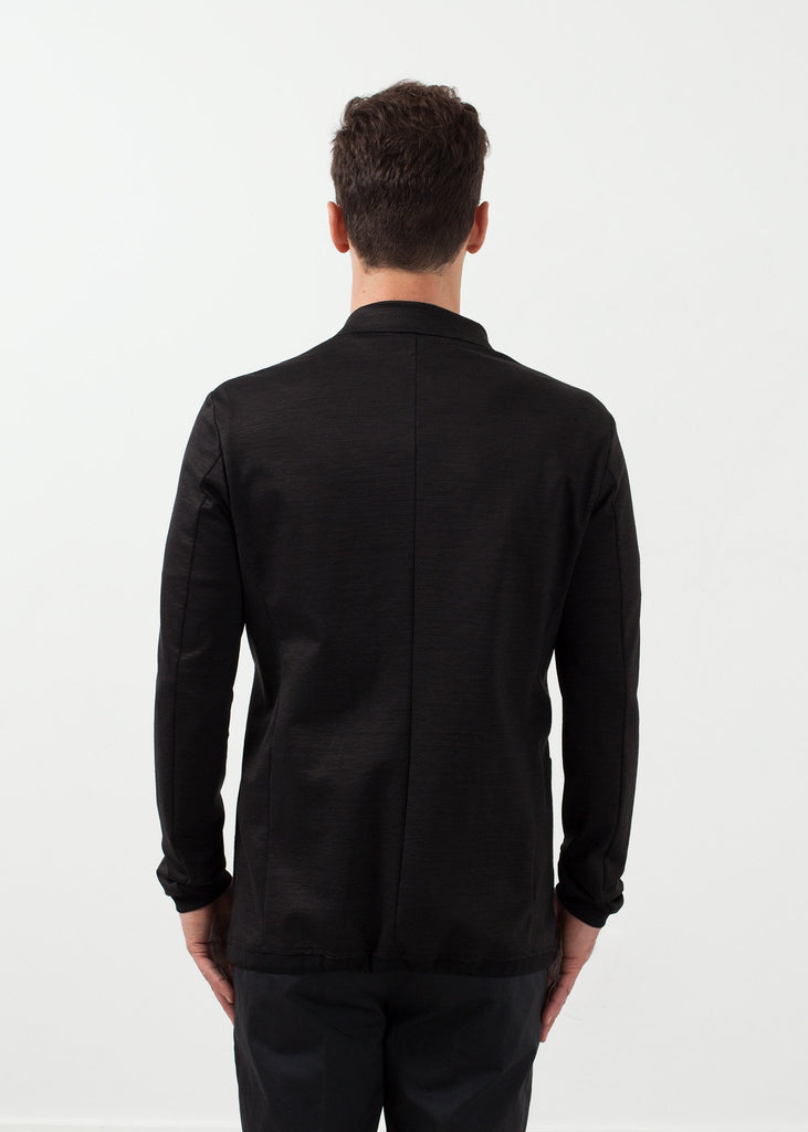 Raw hemming combined with a heathered knit makes this blazer a keeper. Three exterior pockets. Three button closure at front. Drawstring at waist. Mauro Grifoni. Color Charcoal. 61% Ramie, 25% Nylon, 14% Spandex, Ribbing 95% Polyester, 5% Spandex. Made in Italy. Jacob is wearing a Size 50.