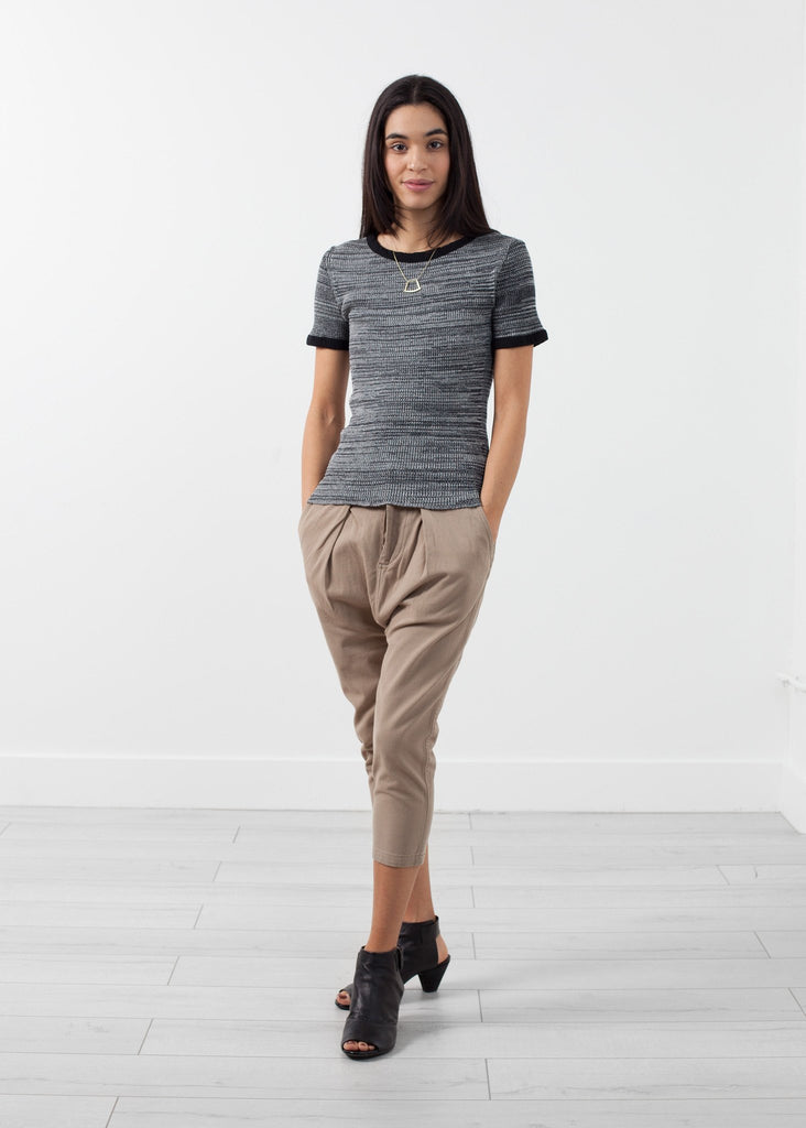 The Waffle Knit Crew offers uniqueness of texture without sacrificing comfort. Short sleeves. Asymmetrical hemline. Exposed seaming at center back. V:Room. Color Charcoal. 100% Cotton. Made in Japan. Ashley is wearing an X-Small.
