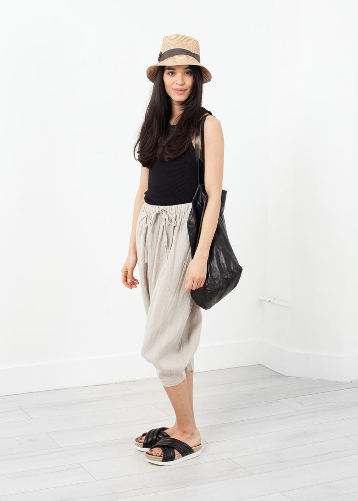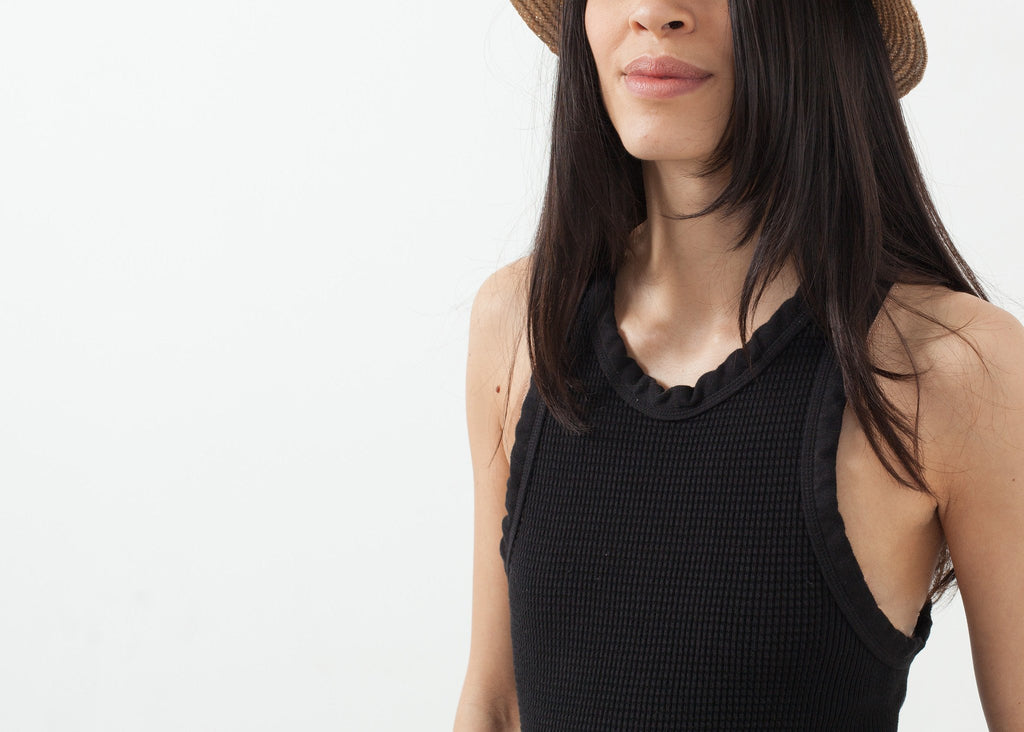 The combination of waffle and rib knits offers uniqueness in look with lots of stretch for perfection in fit. Crew neckline. Extended button placket at front. V:Room. Color Black. 100% Cotton. Made in Japan. Ashley is wearing an S/M.
